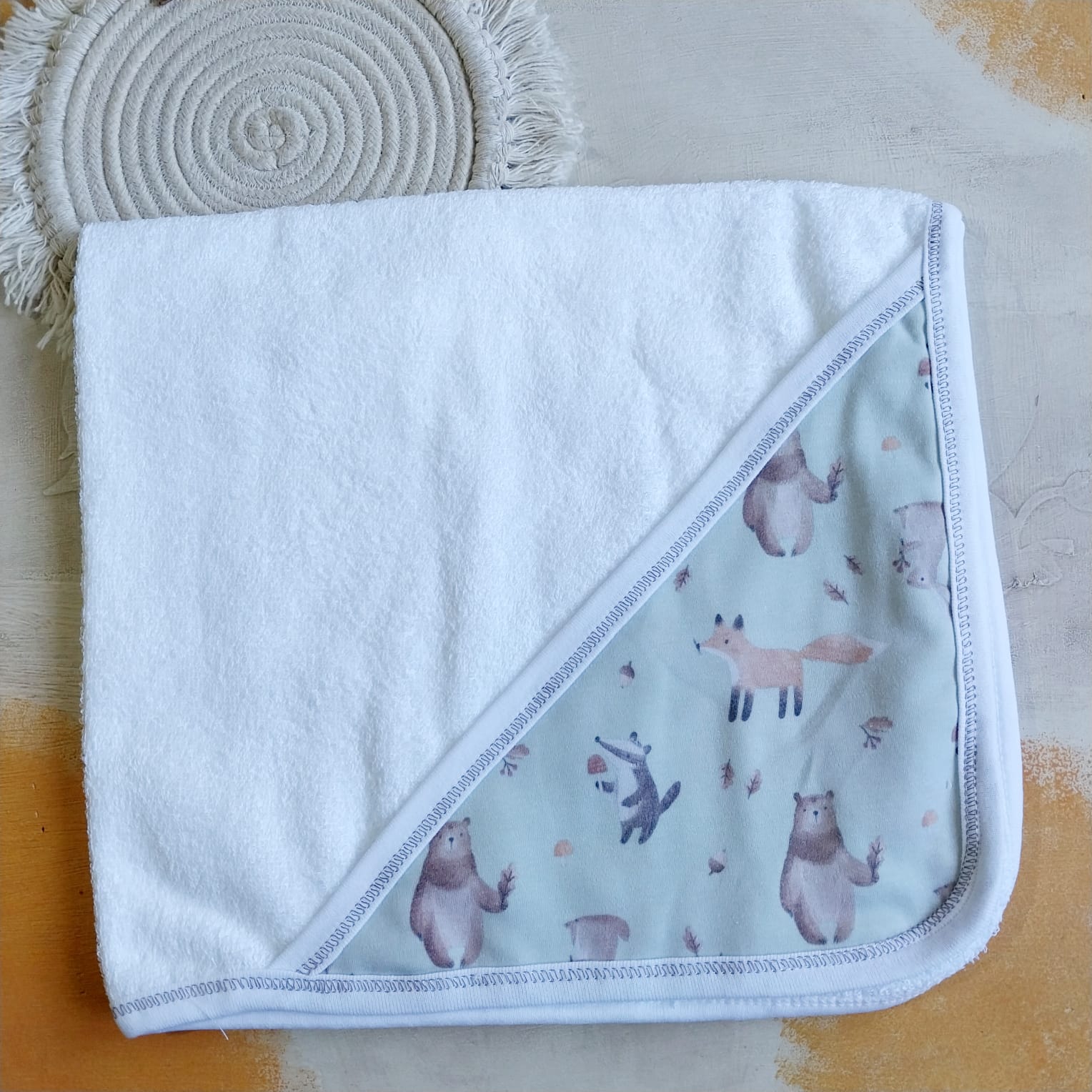Toallón blanco con capucha estamoada en los tonos verdes con animalitos.